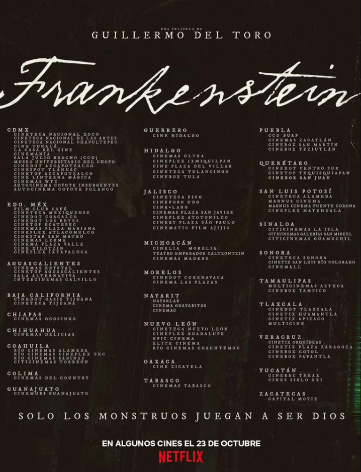 ¿En que cines se proyectará Frankenstein de Guillermo del Toro en CDMX?