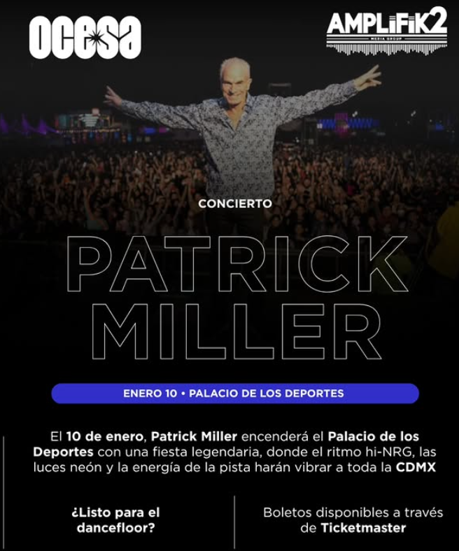 El DJ Patrick Miller regresará a los escenarios en el Palacio de los Deportes, con un show programado para el 10 de enero de 2026. El evento ofrecerá un recorrido por géneros musicales como hi-NRG, Italo disco, techno y new beat, con décadas de cultura dance y diferentes generaciones en torno a la música de pista de baile.