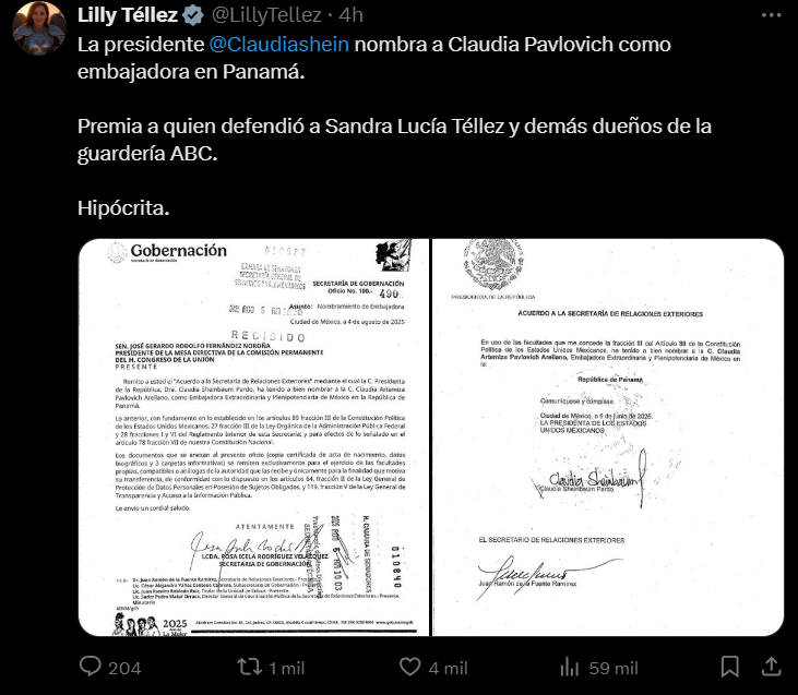 Claudia Pavlovich, exgobernadora de Sonora por el PRI, fue designada como embajadora de México en Panamá por la presidenta Claudia Sheinbaum. El nombramiento, enviado a la Comisión Permanente el 6 de agosto de 2025, ya generó reacciones políticas, incluyendo críticas de la senadora Lilly Téllez por su supuesto vínculo con el caso de la guardería ABC. Pavlovich, actual cónsul en Barcelona, busca convertirse en la próxima representante diplomática de México en Centroamérica, marcando otro capítulo en su transición del PRI al servicio exterior bajo gobiernos de Morena.