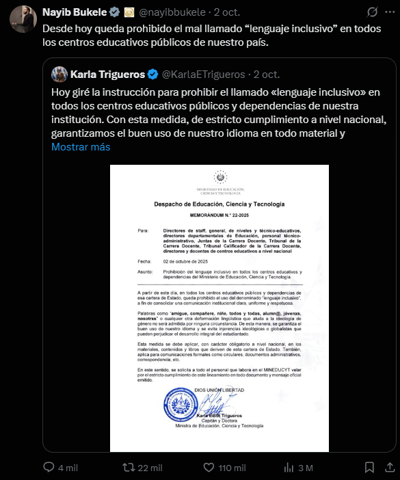 El anuncio se realizó por la noche a través de X, donde el propio presidente compartió un comunicado de la ministra. En el memorándum dirigido a directores, departamentos y personal administrativo, se establece que la prohibición es de carácter obligatorio a nivel nacional, aplicable no solo en los libros de texto y programas educativos, sino también en circulares, documentos internos y correspondencia oficial del Ministerio de Educación.