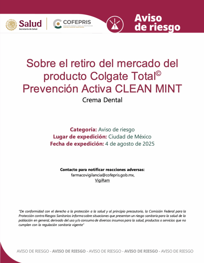 «El retiro se limita exclusivamente al producto Crema Dental Colgate Total Prevención Activa Clean Mint», especificó la dependencia en su comunicado oficial.
