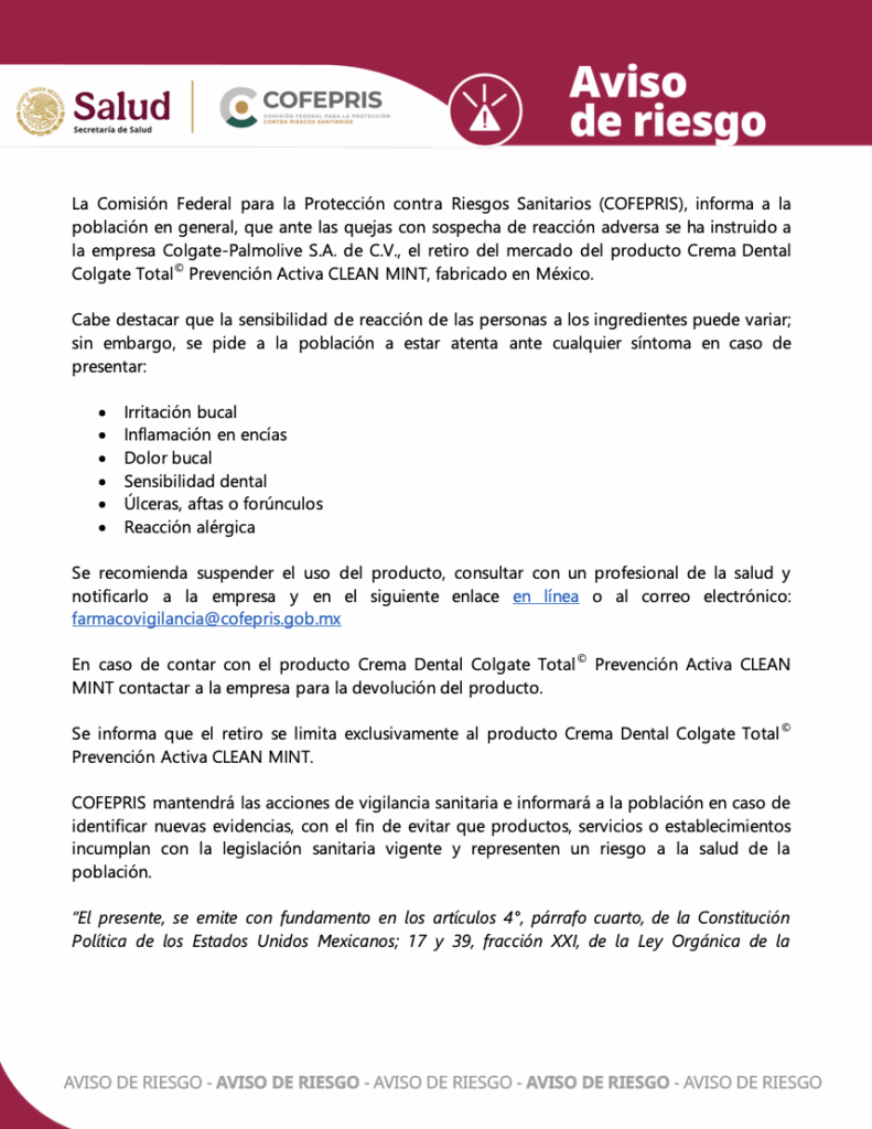 El 4 de agosto de 2025, la Comisión Federal para la Protección contra Riesgos Sanitarios emitió una alerta sobre el producto Colgate Total Prevención Activa Clean Mint, fabricado en México, tras recibir múltiples reportes de reacciones adversas en consumidores. La medida afecta específicamente esta presentación y no otros productos de la marca. La autoridad sanitaria instruyó a Colgate-Palmolive retirar el artículo del mercado mientras se investigan las causas exactas de los efectos secundarios reportados.