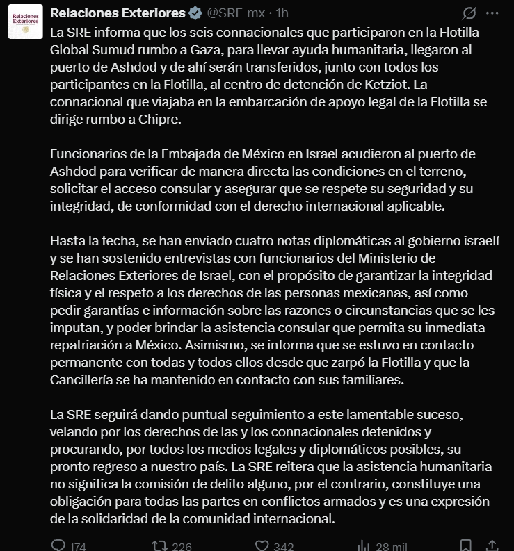 La SRE ha emitido un comunicado exigiendo el respeto a los derechos humanos de los detenidos y su liberación inmediata. Además, ha solicitado la intervención de organismos internacionales para garantizar la protección de los activistas.